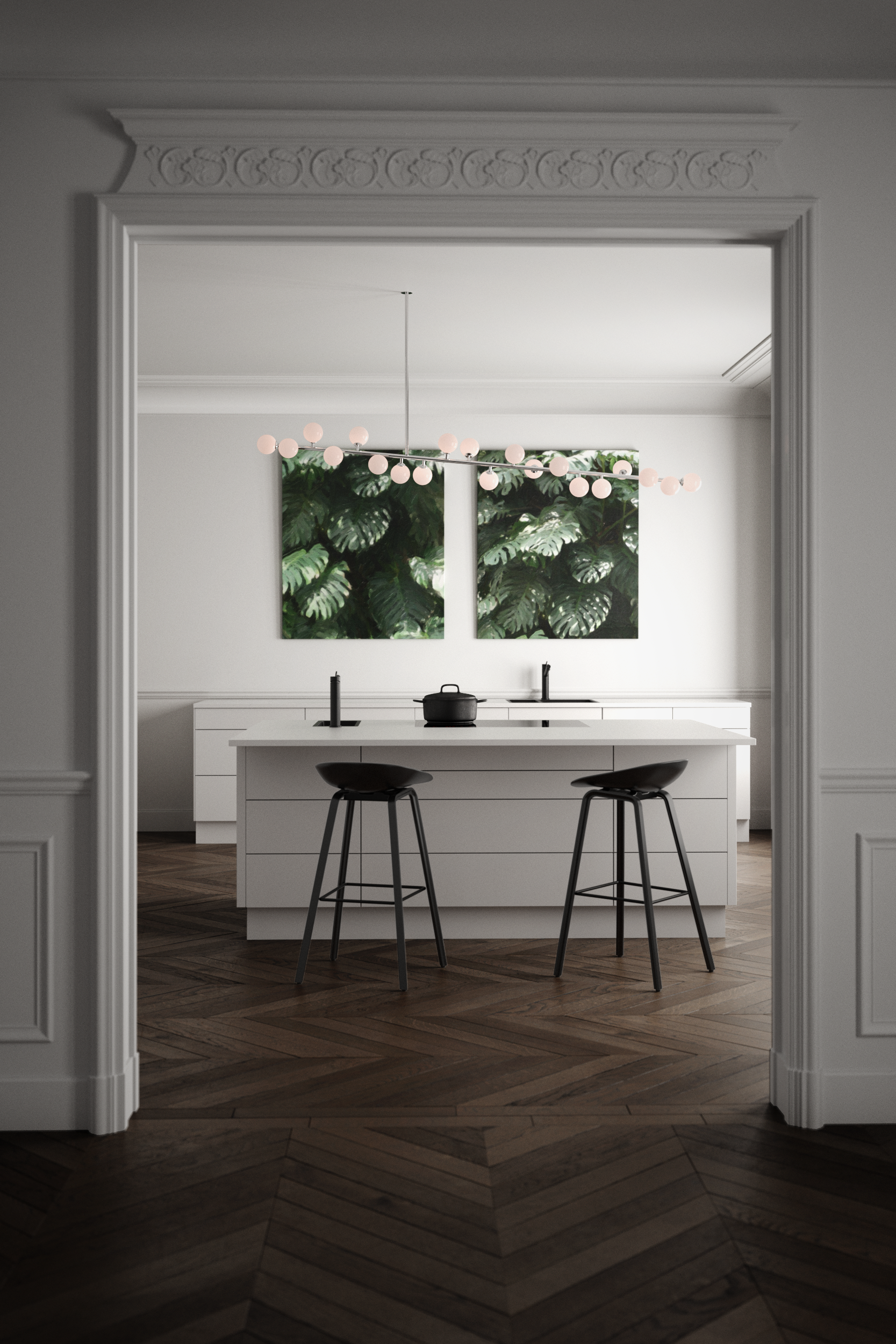 Dieses beeindruckende 3D-Rendering mit modernem Flair zeigt eine stilvolle Altbauwohnung, die durch die harmonische Kombination von klassischer Architektur und modernem Design besticht. Die Innenräume sind in einem klaren Weiß gehalten, was die großzügigen Raumverhältnisse und die hohen Decken der Wohnung unterstreicht.